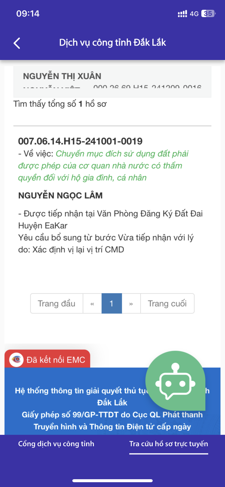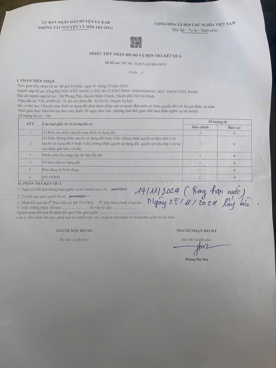 Tôi tên Nguyễn Ngọc Lâm Cccd: 06008500293 có bộ hồ sơ chuyển mục đích sử dụng đất: 007.06.14.H15-241001-0019, đã đóng thuế chuyển mục đích và có giấy hẹn của bộ phận một cửa huyện Ea Kar hẹn ngày lấy bìa 25/11/2024. Đến nay, đã trễ hẹn cả nửa tháng rồi mà bên Bộ phận một cửa huyện Ea Kar vẫn không phản hồi cho tôi biết là khi nào thì tôi nhận được bìa. Trong khi, việc chuyển đổi mục đích tôi đã làm theo đúng quy trình, quy định và tư vấn của phòng tài nguyên môi trường huyện Ea Kar. Vì vậy, tôi viết phản ánh này đề nghị Văn phòng đăng ký đất đai và bộ phận một cửa huyện Ea Kar phản hồi cho tôi biết là khi nào thì tôi nhận được sổ hồng?
