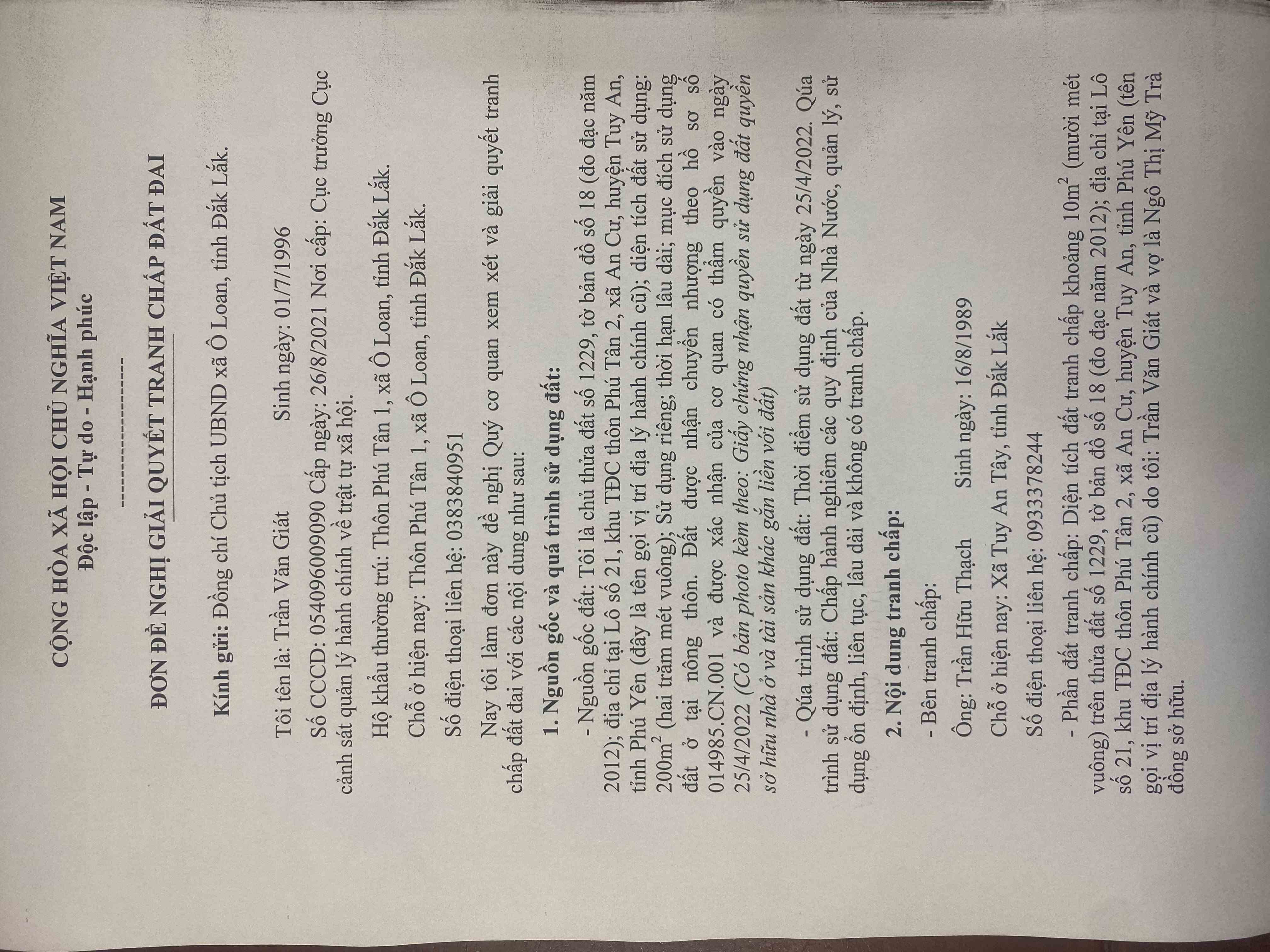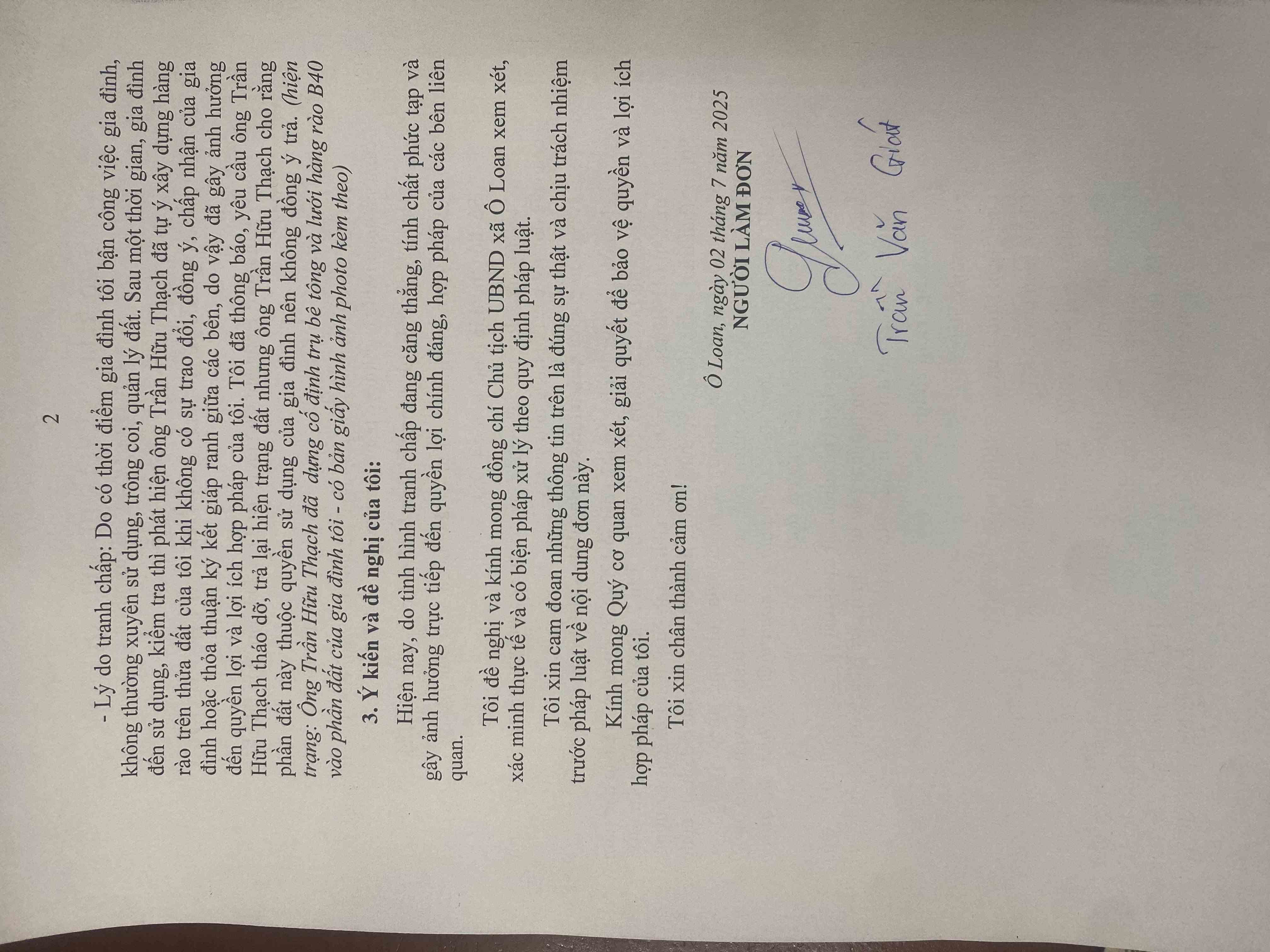đề nghị UBND xã Ô Loan, tỉnh Đắk Lắk và các cơ quan có thầm quyền xem xét Giải quyết HOÀ GIẢI TRANH CHẤP ĐẤT cho tôi. Đơn của tôi đã gửi và tiếp nhận vào ngày 02/7/2025 tại Trung tâm phục vụ hành chính công xã Ô Loan. Tuy nhiên, đến nay vẫn chưa giải quyết cho cá nhân tôi, gây ảnh hưởng đến quyền và lợi ích hợp pháp trực tiếp của cá nhân tôi và gia đình. tôi đã gửi phản ánh lên nền tảng số của tỉnh Đắk Lắk triển khai. Nhưng hiện nay tôi vẫn chưa nhận được bất cứ phản hồi nào của cơ quan chức năng và cấp có thẩm quyền. Do vậy, Kính mong lãnh đạo quan tâm, xem xét giải quyết bảo vệ quyền lợi chính đáng và hợp pháp của nhân dân.