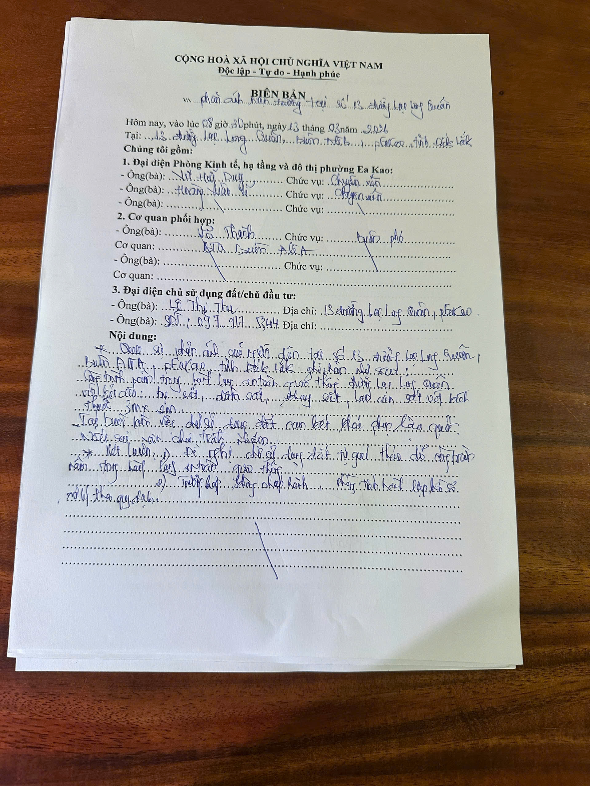 UBND phường Ea Kao đã tiếp nhận phản ánh của công dân tại hẻm 13 Lạc Long Quân, Phường Ea Kao, Tỉnh Đắk Lắk. - Nội dung: xây nhà đổ mê lấn tới đường. UBND phường Ea Kao đã lập biên bản kiểm tra, xác nhận nội dung vi phạm. Chủ sử dụng đã khắc phục. Chúng tôi chân thành cảm ơn công dân đã kịp thời phản ánh và mong tiếp tục nhận được sự đồng hành trong thời gian tới. Trân trọng.