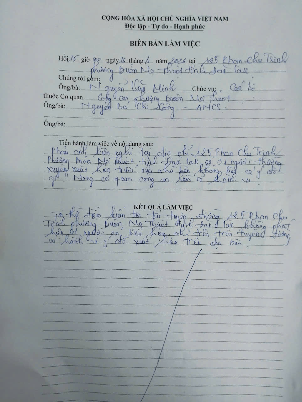 <p>Kính gửi: Quý Ông/Bà.</p> <p>Vấn đề quý Ông/Bà phản ánh, Tổ xử lý phản ánh hiện trường phường Buôn Ma Thuột xin thông báo kết quả như sau:</p> <p>Cảm ơn Quý công dân đã gửi phản ánh về nội dung: "Người này thường xuyên xuất hiện trước cửa nhà bên ko biết ý đồ làm gì ? mong cơ quan chức năng làm rõ hành vi xâm phạm". Công an phường kiểm tra giải quyết lập biên bản về nội dung phản ánh trên. Rất mong Quý công dân tiếp tục đồng hành cùng chính quyền địa phương. Trân trọng cảm ơn!</p> <p>Chân thành cảm ơn quý Ông/Bà.</p> <p>Trân trọng./.</p>